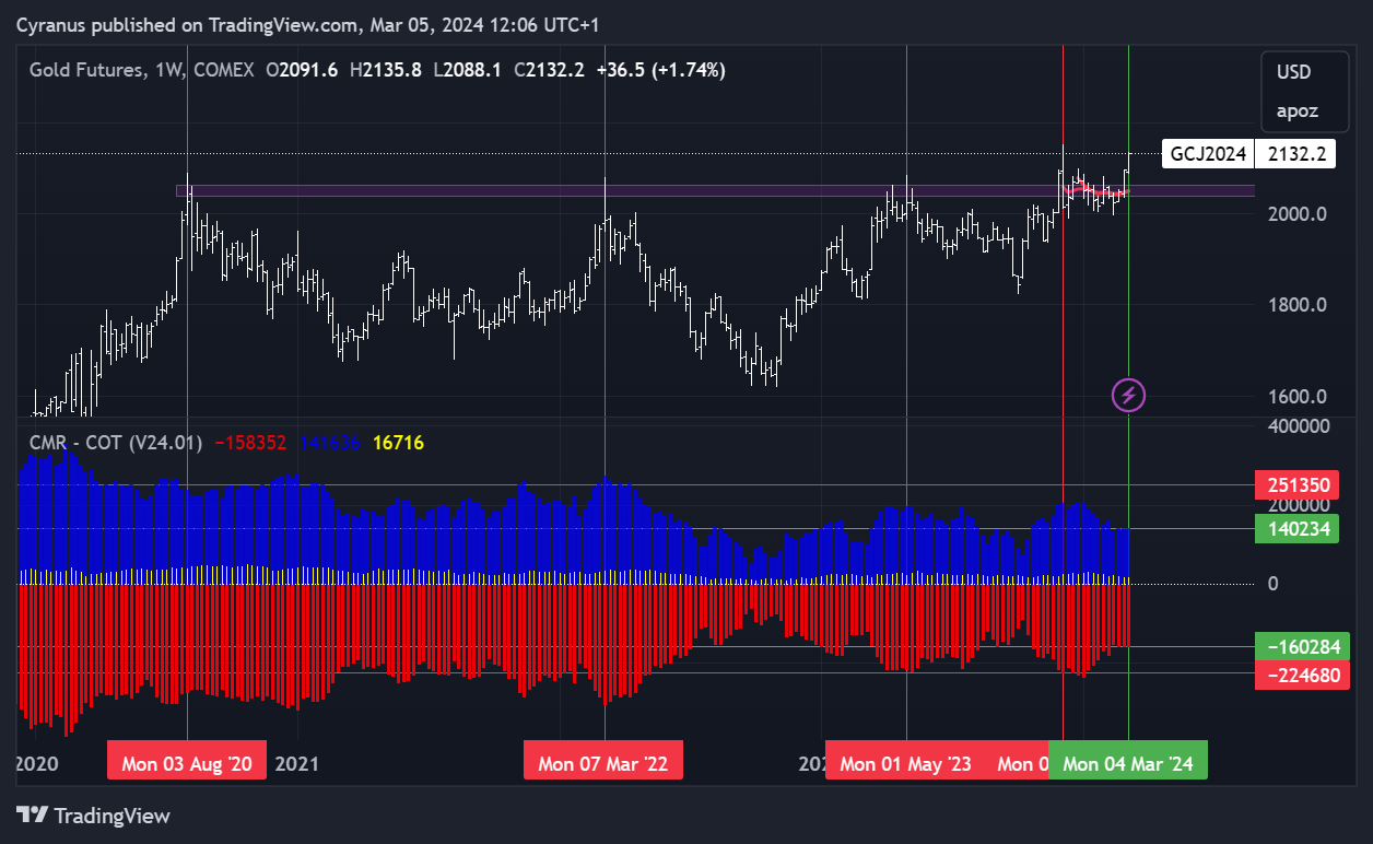 The other times we considerably broke above 2000$ we did have a much higher level of speculator longs, both large (blue), but especially small (yellow) speculators.