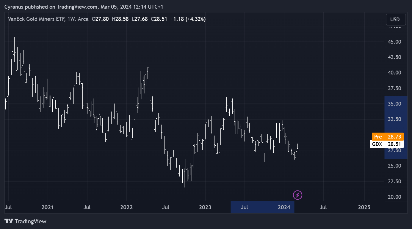 Gold Miners as a leveraged bet on the Gold Price have been getting hammered in the past few months, here you can see the GDX chart: