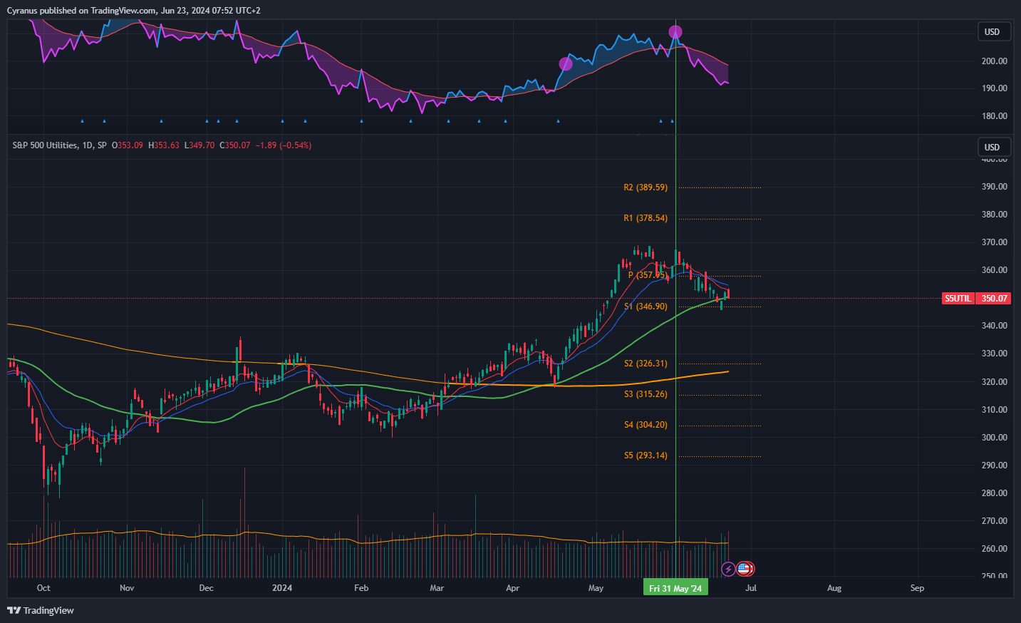 We saw a strong Up move and good relative strength until the end of may, this was fitting the seasonals of the sectors and also had something to do with the AI hype, as people bought into Power Grid Utility stocks, that might profit from more energy expenditure due to more datacenters.
