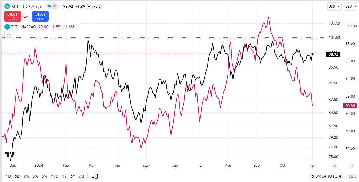 Looking at a whole other direction for the next bullish development: Biotechs have been very strong lately, especially compared to TLT, which historically has a very high correlation to the Longterm Yield sensitive sector: