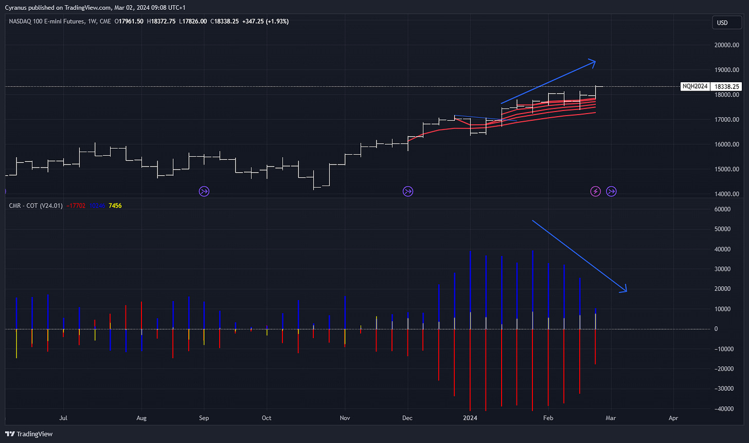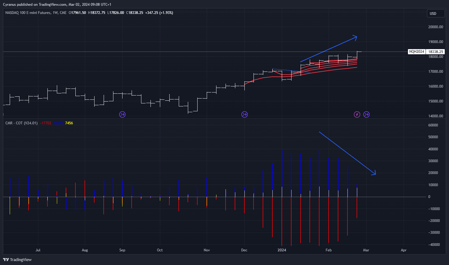 Despite all of that, the Large Speculators have actually decreased their Long positions as price went up, here for example the NQ: