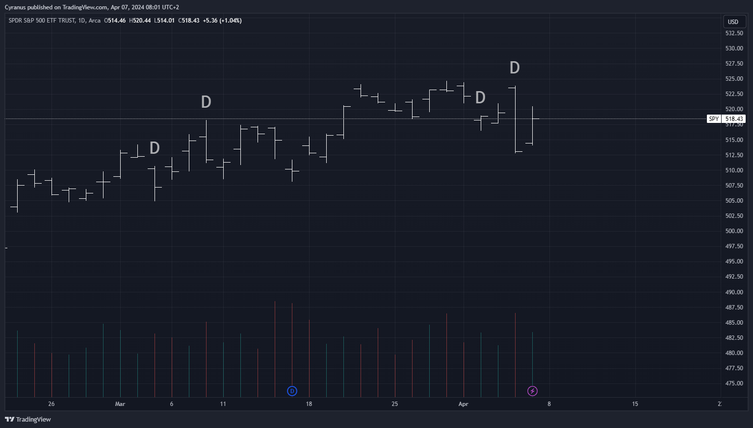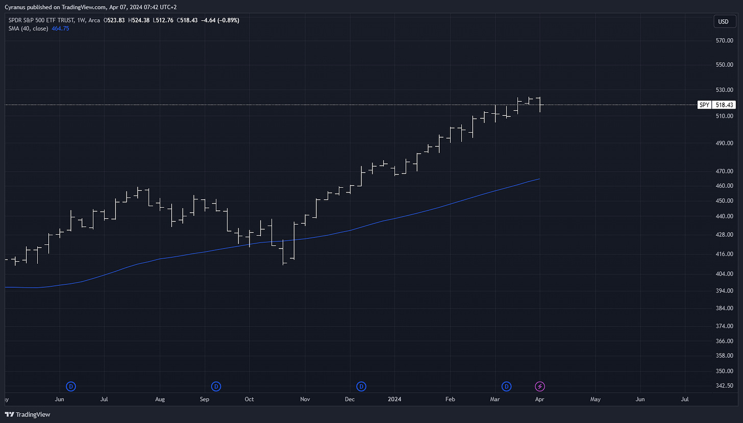 SPY: A down week with volatility rising. Yet firmly above 200 DMA