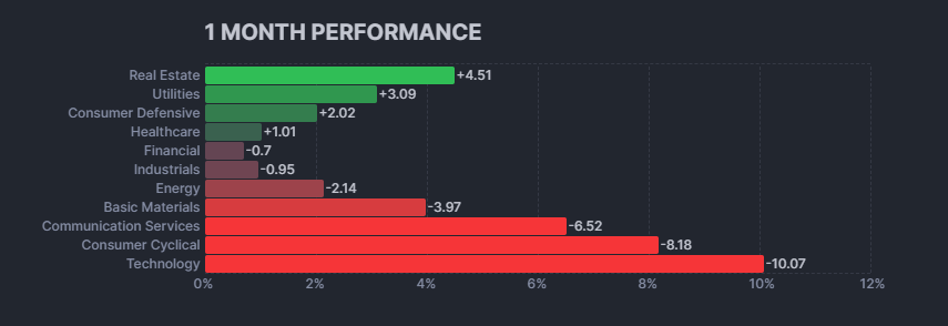 On the monthly performance, we are still seeeing the aggressive sectors getting pummeled and the defensive ones in an uptrend: