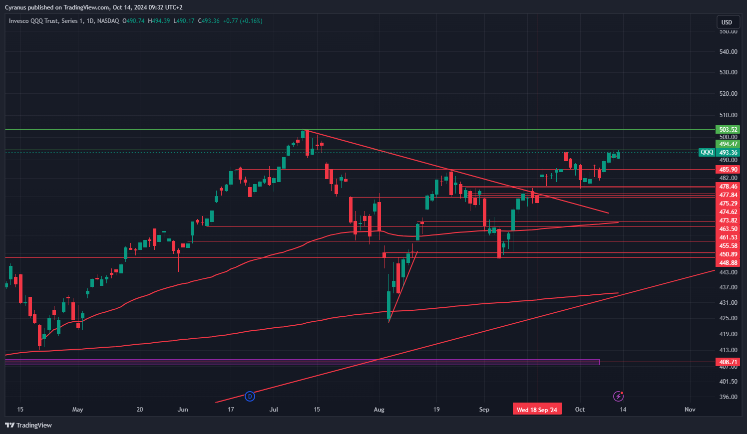 At the same time, Bulls nee to eye a Nasdaq 100 Breakout above 495 first, to then challenge the standing ATH at 503.5