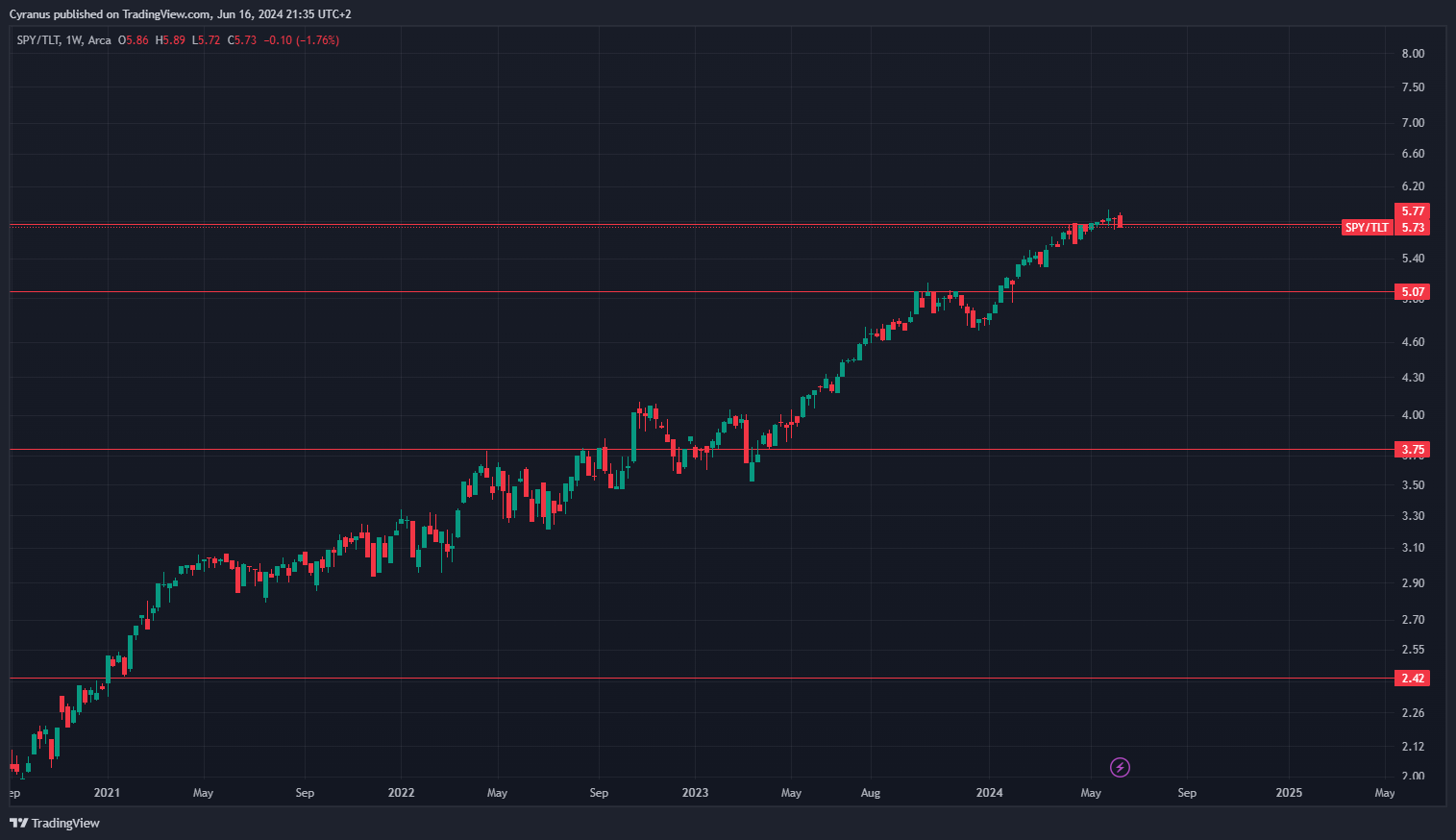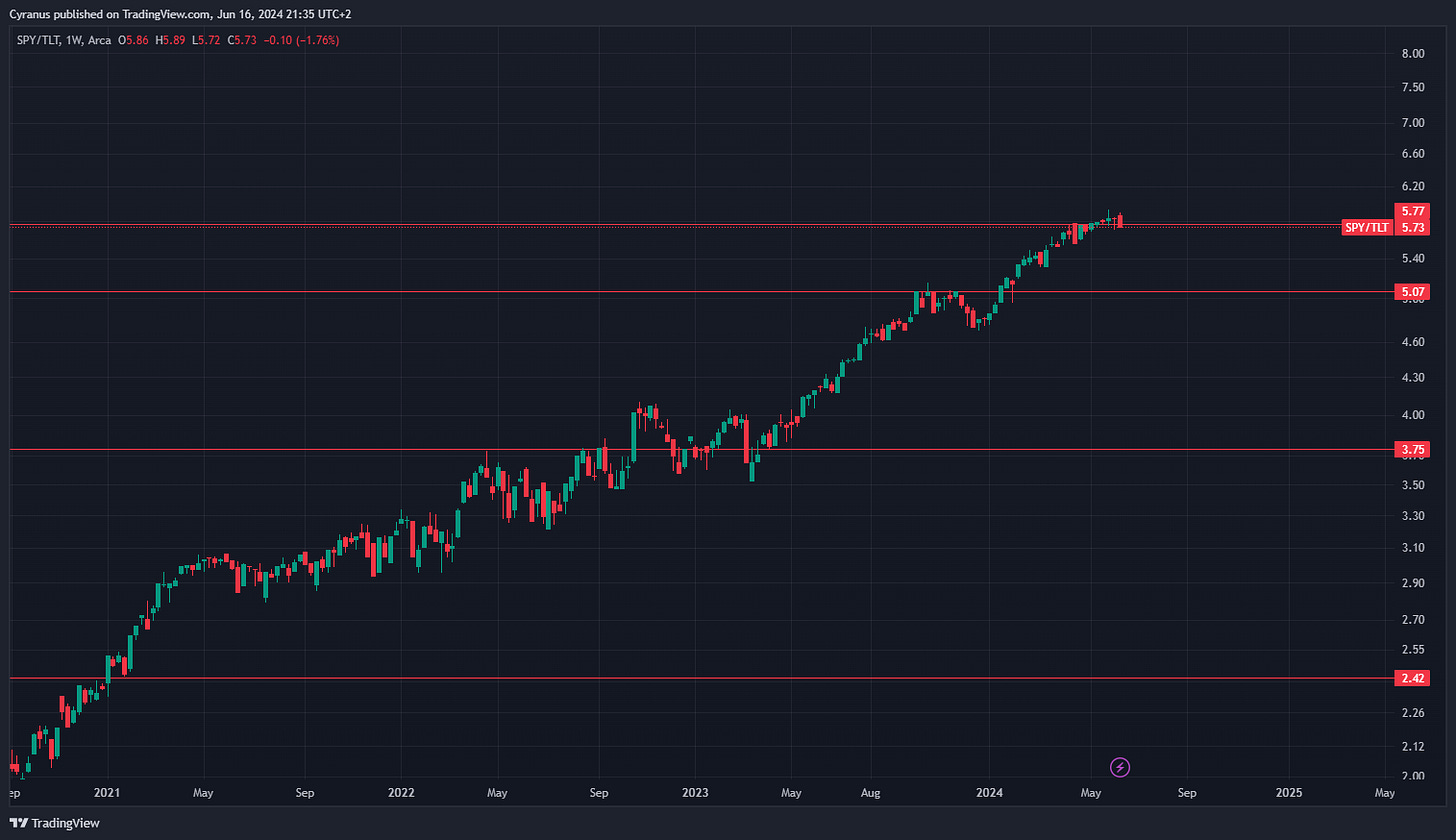 And to the most worrying one, SPY vs TLT getting rejected: