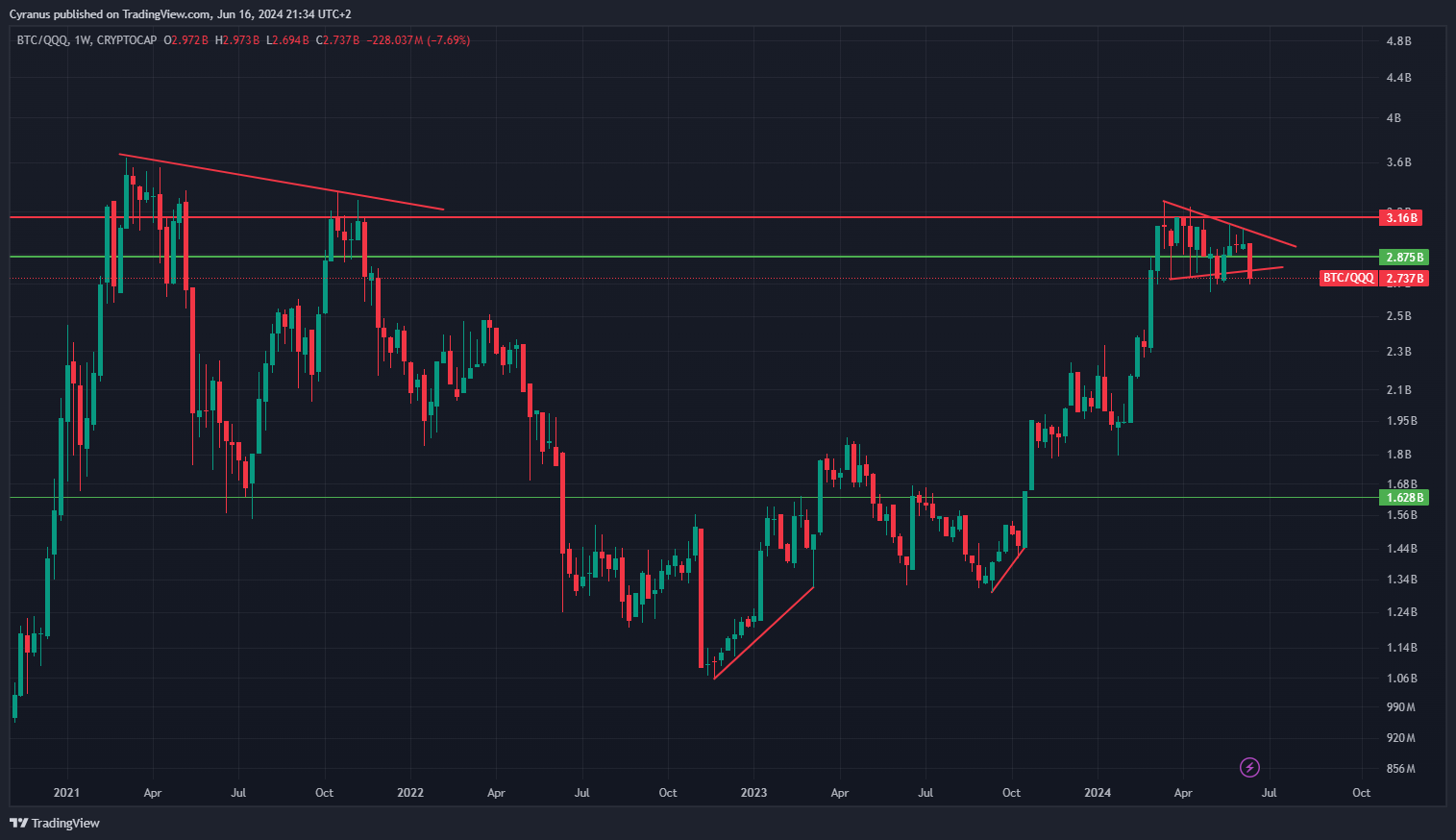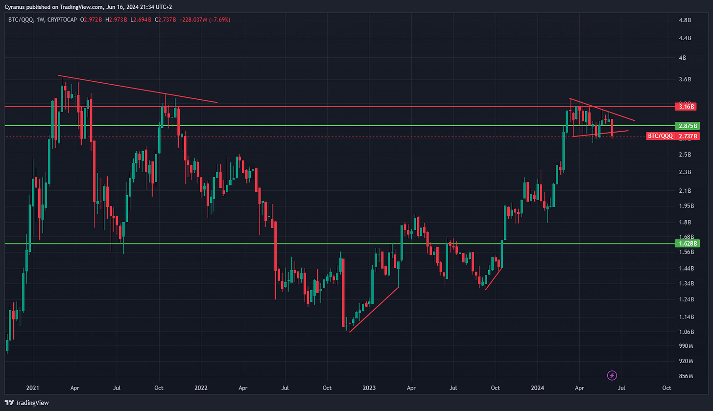 However there are signs for caution, rations that were supposed to be Risk On, breaking down and looking more bearish, like BTC vs QQQ: