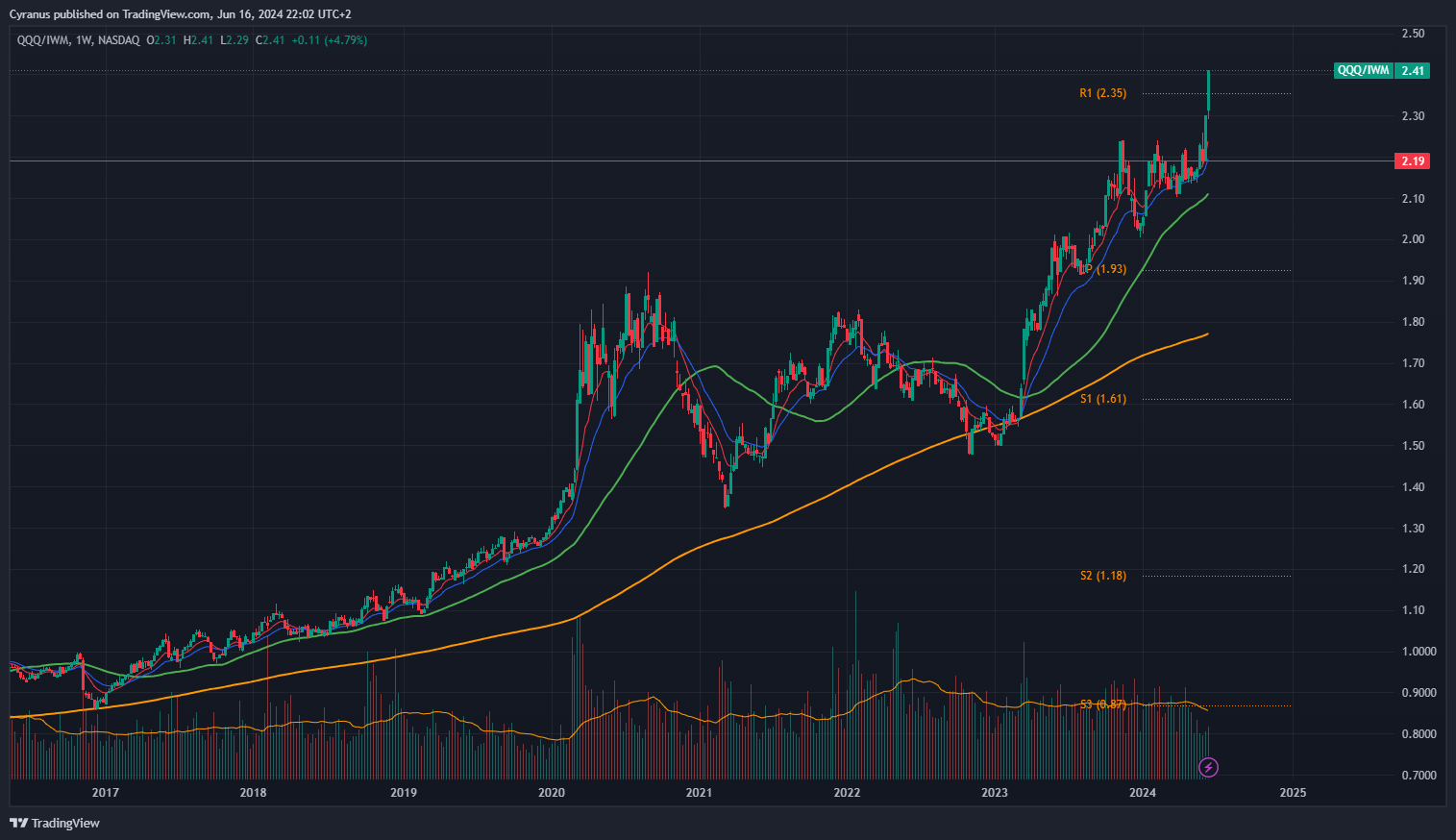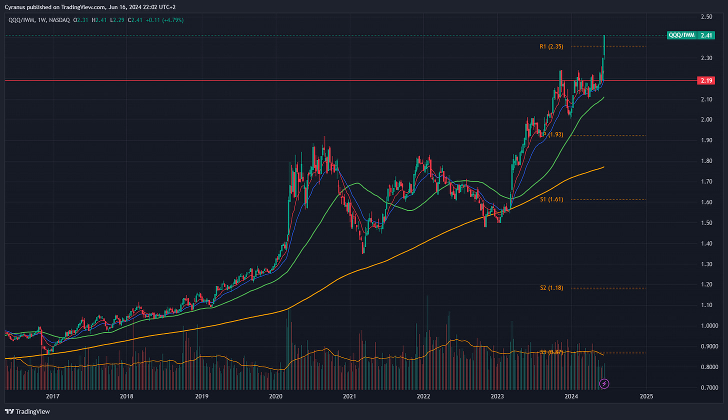 This is QQQ (Tech Index) vs IWM (Small Caps):