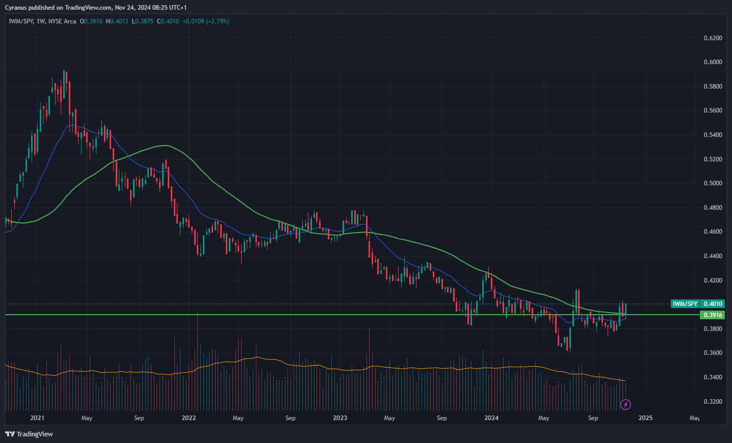 IWM/SPY - Small Caps had been underperforming the S&P 500 since early 2021, but it looks like they are putting in a bottom, this would be confirmed above the July high, which would probably also mean a new ATH for IWM