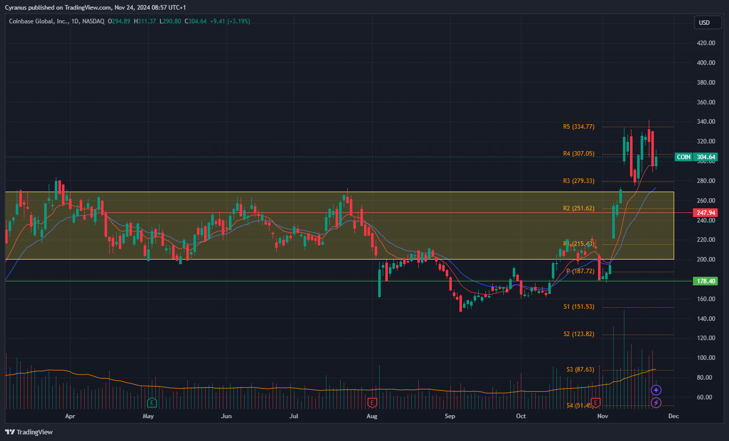 COIN is a way to play a potential Alt Season, it recently broke out of a rectangular consolidation zone and has been shaking out some late buyers.