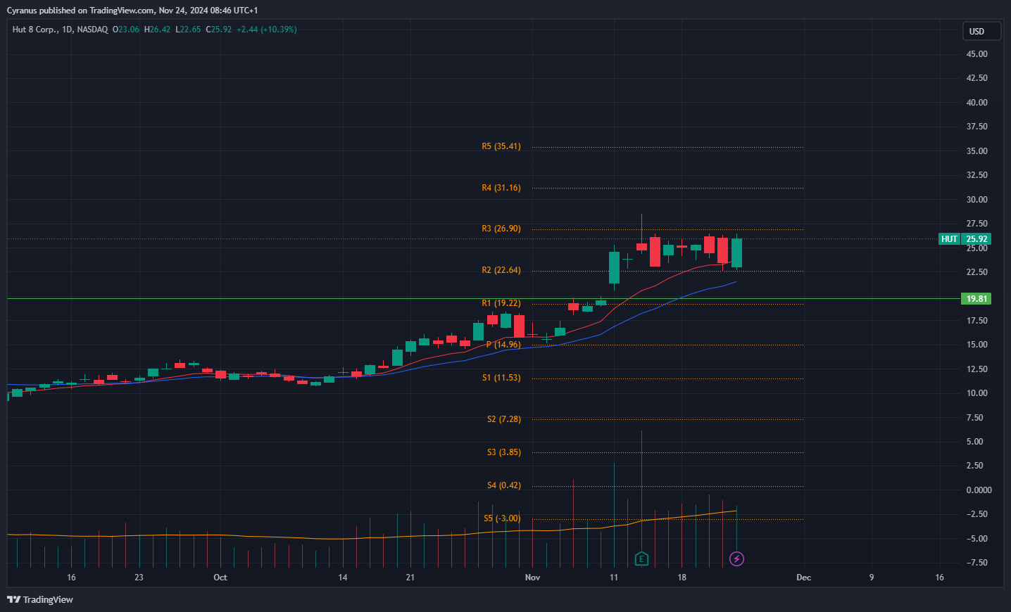 Last week, I showcased HUT as an opportunity to go long, and it did not only work out, but it is still setup as a Buy for me, and I will add to my position at 27$: