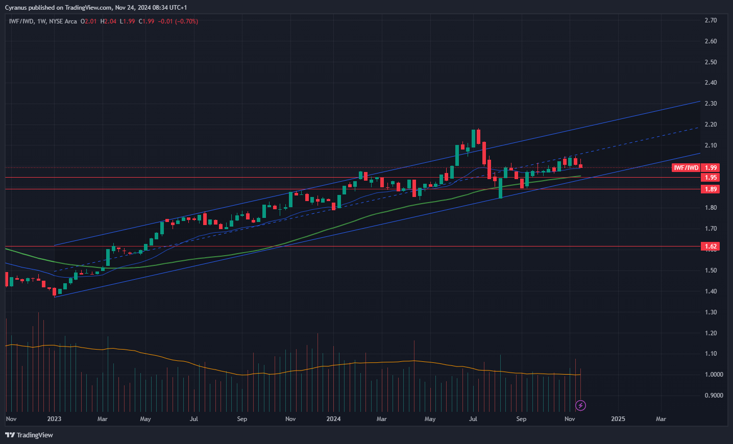 IWF/IWD - Growth vs Value has made no progress last week. But it is at support right now. Even if it would touch the lower line of the Channel it would still be in an uptrend, but it is better if it holds here and goes up quickly.